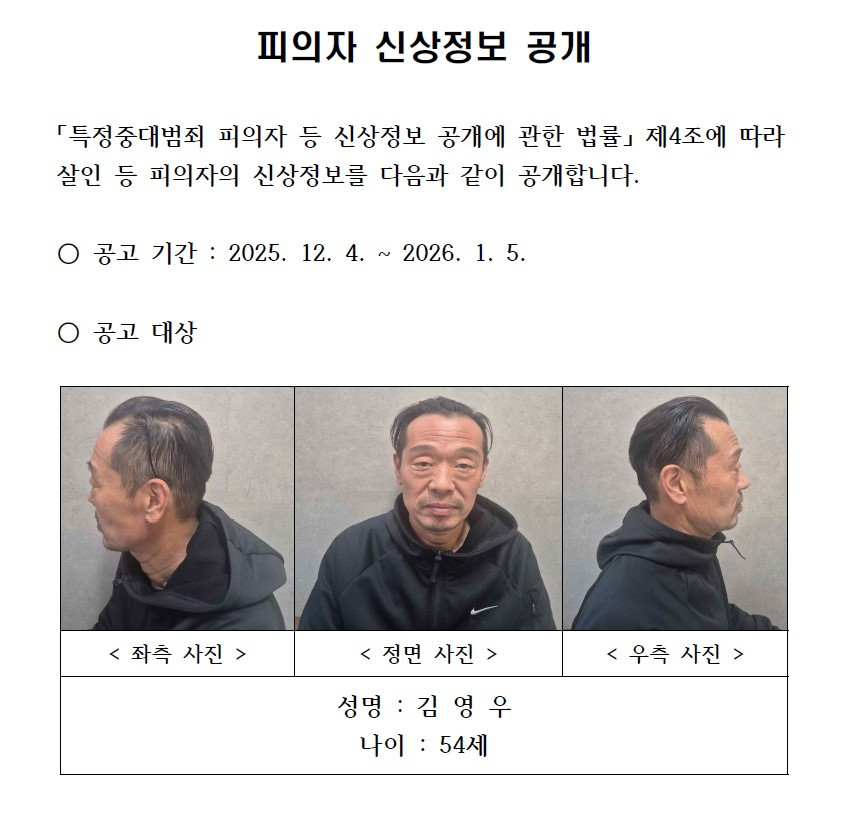 '청주 실종 여성' 살해범 신상 공개…54살 김영우청주에서 발생한 50대 여성 실종 사건과 관련해 실종자를 살해한 피의자의 신상 정보가 공개됐습니다.피의자는 54살 김영우로, 경찰은 피해의 중대성 등을 고려해 앞으로 한달 동안 신상 정보를 공개한다고 밝혔습니다.김영우는 지난 10