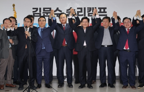 김문수 후보 지지 선언하는 홍준표 캠프 의원들김문수 후보 지지 선언하는 홍준표 캠프 의원들(서울=연합뉴스) 류영석 기자 = 국민의힘 김문수 제21대 대통령 선거 경선 후보가 30일 서울 여의도 대하빌딩 후보 캠프 사무실에서 지지 선언을 위해 찾은 홍준표 전 대구시장 경선 캠프 소속 의원들과 함께 손을 맞잡고 있다. 2025.4.30