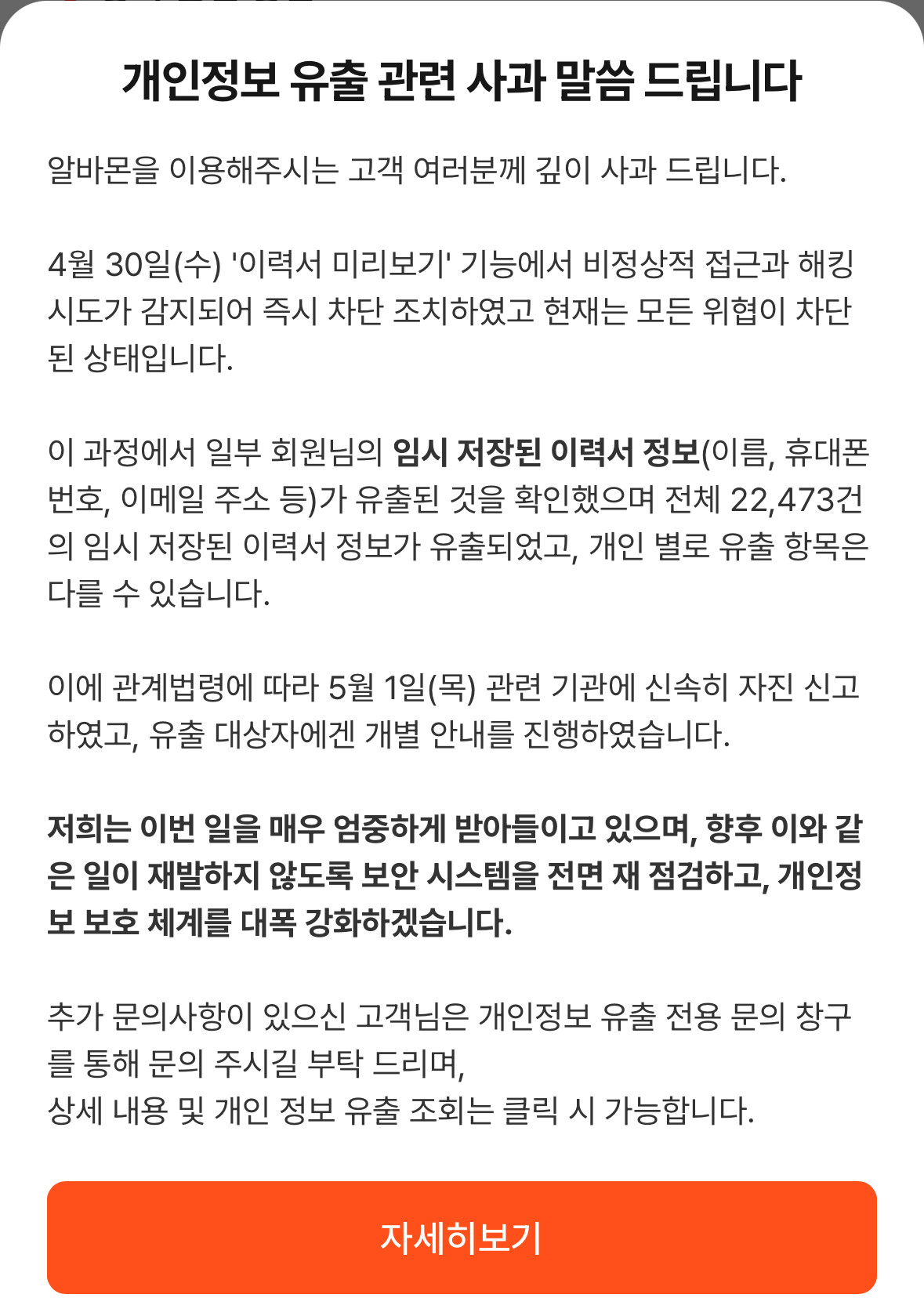 알바몬은 지난 1일 자사 홈페이지 공지 사항을 통해 “지난 4월 30일 시스템에서 비정상적인 접근 징후를 감지하고 즉시 대응에 나섰으며 이 과정에서 총 22,473건의 임시 저장된 이력서 정보가 유출된 사실을 확인했다”고 밝혔습니다.