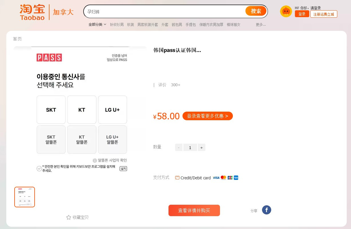 약 1만 2천 원에 거래되는 ‘한국 PASS 인증 대행’ 서비스[타오바오 캡처][타오바오 캡처]연합뉴스TV 기사문의 및 제보 : 카톡/라인 jebo23