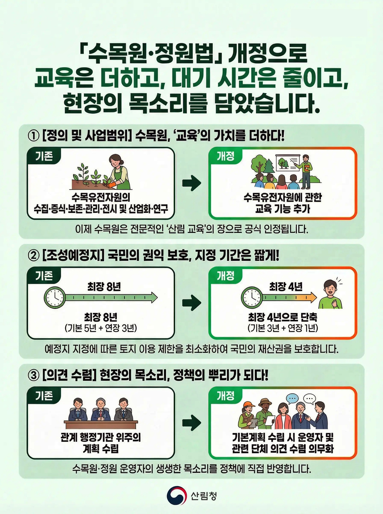 수목원·정원의 조성 및 진흥에 관한 법률 개정안은 수목원의 정의와 사업 범위에 '교육 기능'을 추가해 식물자원 보전기관뿐 아니라 생태·환경 교육기관으로써의 역할을 명확하게 규정함으로써 수목원이 생물다양성 보전과 국민의 삶의 질을 향상하는 핵심 인프라로 자리매김할 수 있도록 했습니다.