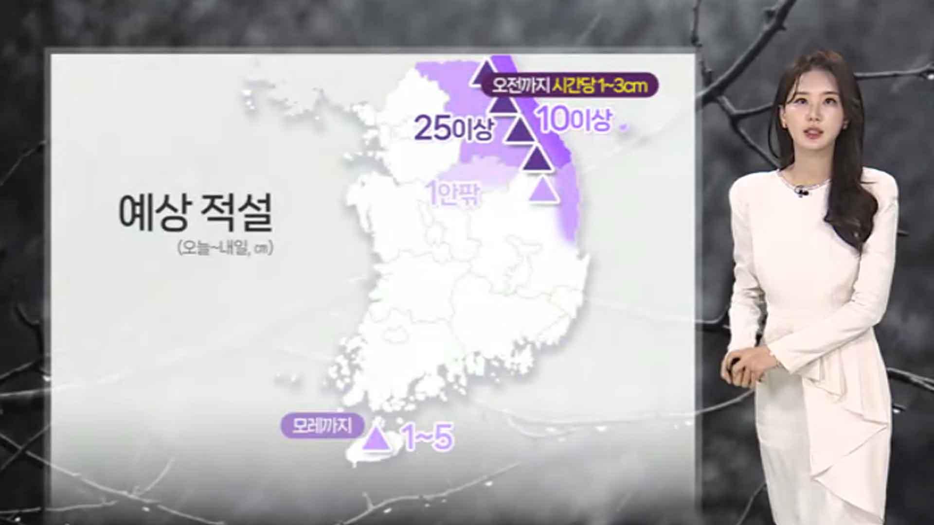 특히 내일 오전까지 강원 산지와 동해안을 중심으로 시간당 최고 3cm 안팎의 눈이 펑펑 쏟아지겠는데요.
