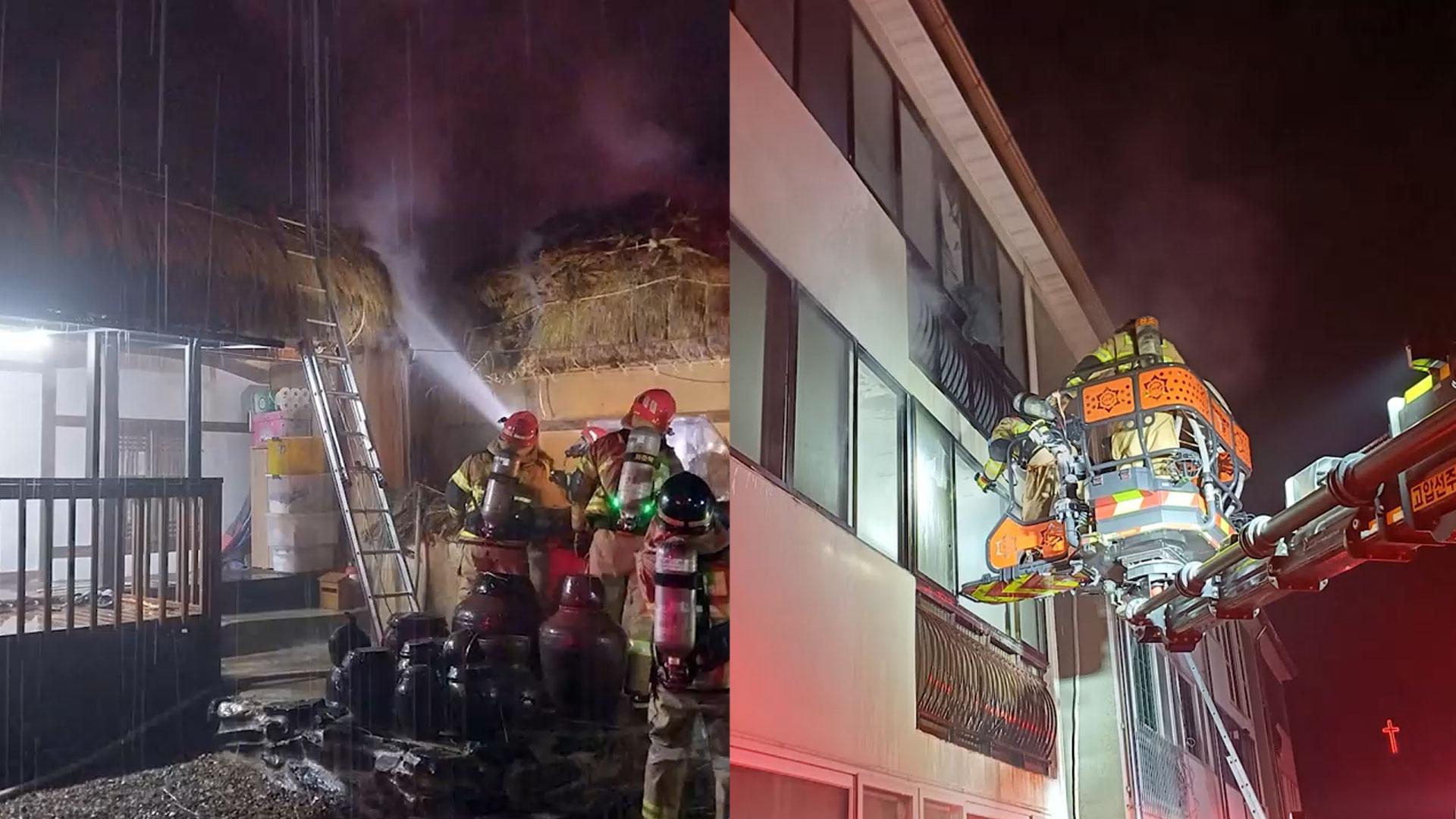 짚으로 만든 지붕을 향해 소방대원들이 연신 물을 뿌립니다.