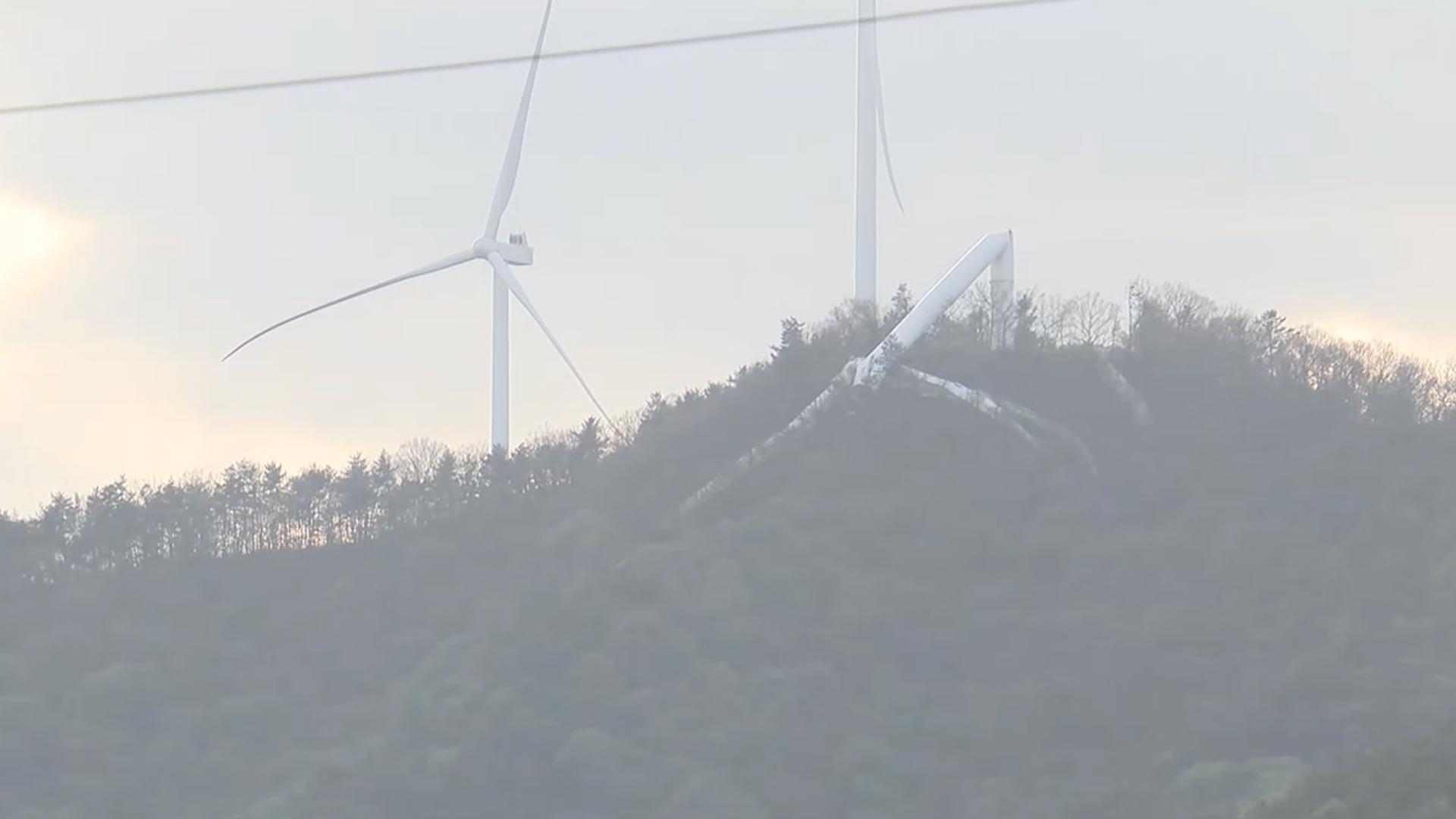 화순군 등에 따르면 어제(21일) 새벽 2시 50분쯤 화순군 도암면 우치리 화학산에 건설된 4.7MW(메가와트)급 풍력발전기 타워 1기가 부러져 전복됐습니다.