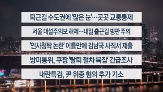 [이시각헤드라인] 12월 4일 뉴스투나잇■퇴근길 수도권에 '많은 눈'…곳곳 교통통제■퇴근길 서울 등 수도권에 눈이 거세게 쏟아졌습니다.저녁 들어 서울과 경기 곳곳에 시간당 5㎝ 이상 눈이 쏟아지며 곳곳의 교통이 통제됐습니다.■서울 대설주의보 해제…내일 출근길 빙판 주의